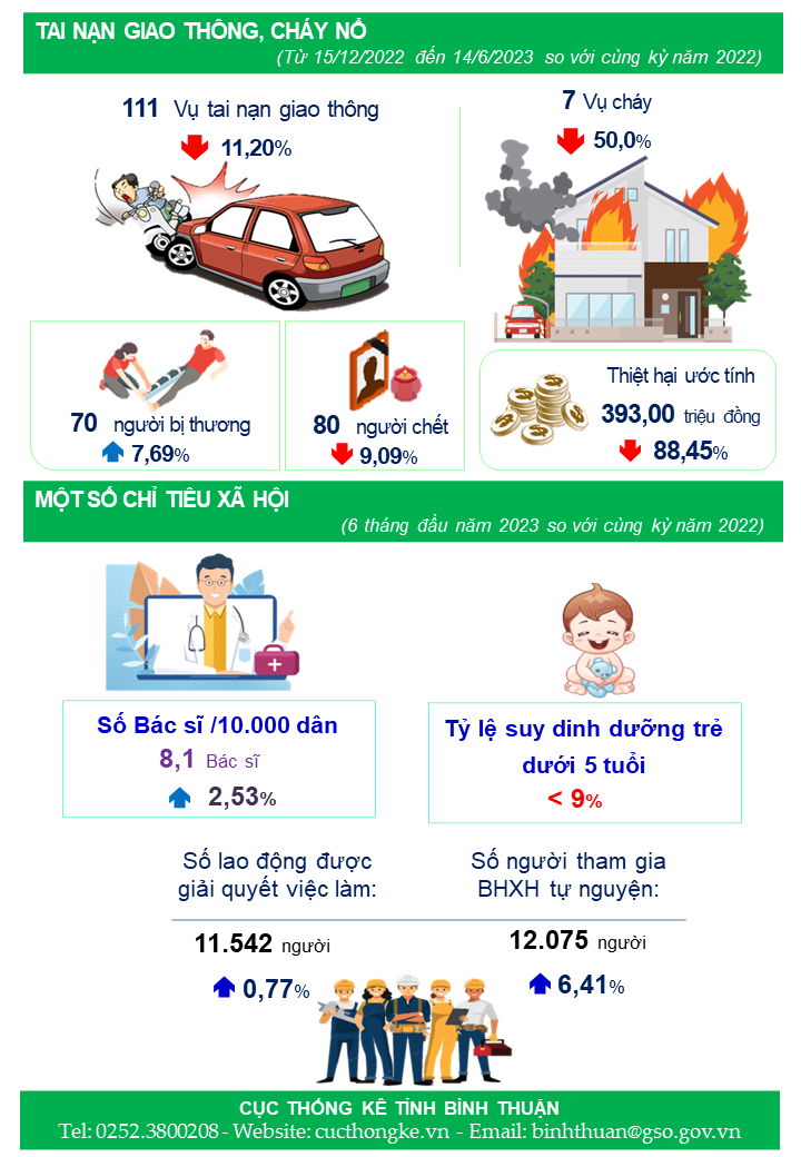 Trong 6 tháng đầu năm 2023 hoạt động du lịch diễn ra khá nhộn nhịp, dịch vụ lữ hành hoạt động ổn định và tiếp tục tăng cường; các nhà hàng, cơ sở kinh doanh ăn uống đảm bảo chất lượng an toàn vệ sinh thực phẩm, niêm yết giá bán, tuân thủ theo quy định của cơ quan quản lý; tuyến du lịch đảo Phú Quý, tuyến cao tốc Dầu Giây - Phan Thiết, Phan Thiết - Vĩnh Hảo đi vào hoạt động thu hút khá nhiều du khách đến tham quan nghỉ dưỡng. Tiếp tục hưởng ứng Năm Du lịch quốc gia 2023 “Bình Thuận - Hội tụ xanh”, tại địa phương diễn ra một số hoạt động văn hoá, thể thao mang tầm quốc gia như giải chạy Stop And Run Marathon Bình Thuận 2023, lễ hội thả diều trên bãi biển thành phố Phan Thiết, cuộc thi Hoa hậu và Nam vương Siêu mẫu Thể hình Thế giới - Miss & Mister Fitness Super Model World 2023, chung kết Giải billiards & snooker vô địch quốc gia năm 2023, giải Đua thuyền truyền thống vô địch quốc gia năm 2023,… đã thu hút rất đông du khách đến tham dự nên doanh thu và lượng khách tăng so với cùng kỳ năm trước.