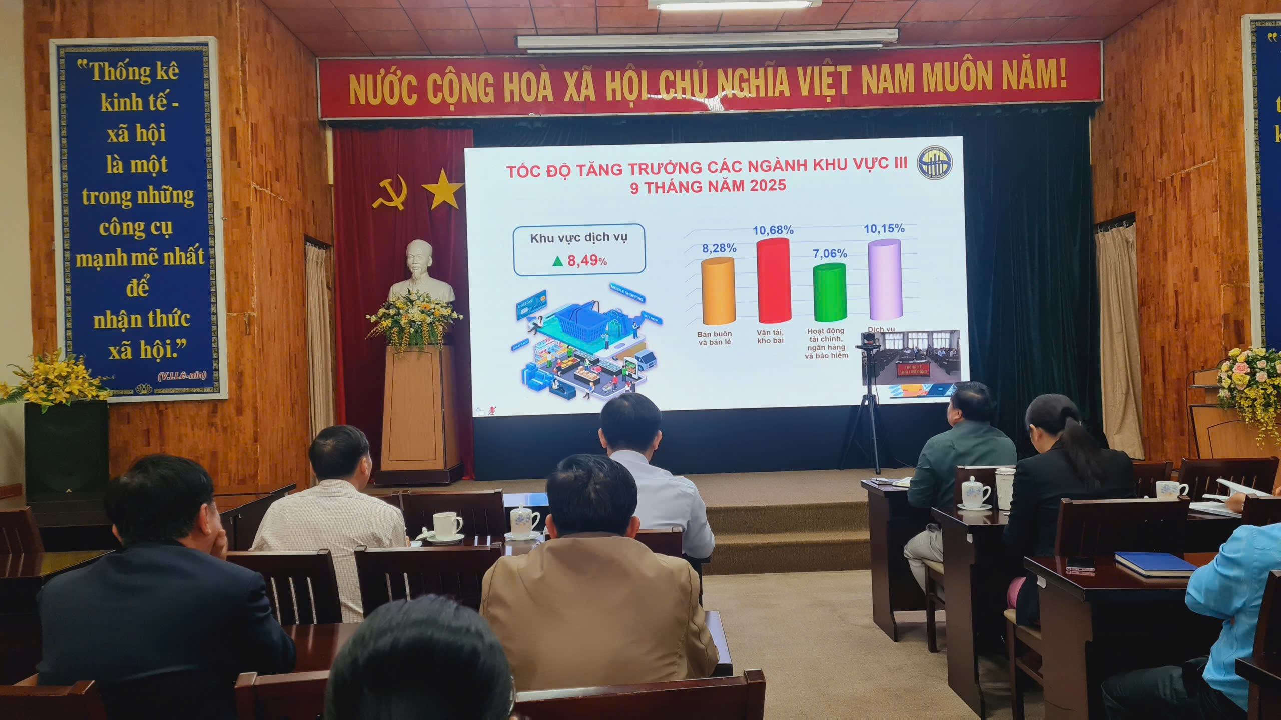 Tại cuộc họp, bà Nguyễn Thị Hương - Cục trưởng Cục Thống kê đã công bố những chỉ tiêu chủ yếu về tình hình kinh tế - xã hội của Việt Nam trong quý III và 9 tháng đầu năm 2025. Theo đó, tổng sản phẩm trong nước (GDP) quý III/2025 ước tăng 8,23% so với cùng kỳ năm trước, chỉ thấp hơn mức tăng 14,38% của cùng kỳ năm 2022 trong giai đoạn 2011-2025. GDP chín tháng năm 2025 ước tăng 7,85% so với cùng kỳ năm trước, chỉ thấp hơn tốc độ tăng 9,44% của cùng kỳ năm 2022 trong giai đoạn 2011-2025. Trong đó, khu vực nông, lâm nghiệp và thủy sản tăng 3,83%, đóng góp 5,36% vào mức tăng tổng giá trị tăng thêm của toàn nền kinh tế; khu vực công nghiệp và xây dựng tăng 8,69%, đóng góp 43,05%; khu vực dịch vụ tăng 8,49%, đóng góp 51,59%.