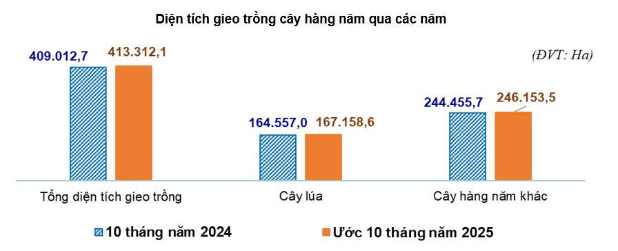Tình hình sản xuất nông, lâm nghiệp và thủy sản tháng 10 và 10 tháng năm 2025 tiếp tục duy trì và phát triển ổn định. Diện tích các loại cây trồng có giá trị kinh tế cao, đặc biệt là sản xuất nông nghiệp ứng dụng công nghệ cao tiếp tục tăng so với cùng kỳ. Chăn nuôi duy trì xu hướng tích cực, đàn gia cầm và đàn lợn đều tăng so với cùng kỳ. Tình hình dịch bệnh trên cây trồng, vật nuôi, nhất là bệnh Dịch tả lợn Châu Phi được kiểm soát hiệu quả, giúp người dân yên tâm đầu tư. Sản lượng khai thác thủy sản biển ổn định. Công tác phát triển kinh tế hợp tác, hợp tác xã và Chương trình OCOP được chú trọng; nhiều doanh nghiệp, chủ thể sản xuất được hỗ trợ quảng bá, giới thiệu sản phẩm nông sản chủ lực, sản phẩm OCCOP tại các hội nghị, triển lãm trong cả nước, góp phần nâng cao giá trị và thương hiệu nông nghiệp của tỉnh.