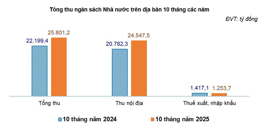Lũy kế 10 tháng năm 2025 ước đạt 25.801,2 tỷ đồng, bằng 91,33% kế hoạch năm và tăng 16,22% so với cùng kỳ năm trước, trong đó: thu nội địa ước đạt 24.547,5 tỷ đồng, bằng 92,25% kế hoạch năm và tăng 18,12% so với cùng kỳ năm trước; thu cân đối ngân sách từ hoạt động xuất, nhập khẩu ước đạt 1.253,7 tỷ đồng, bằng 76,49% kế hoạch năm và giảm 11,53% so với cùng kỳ năm trước.