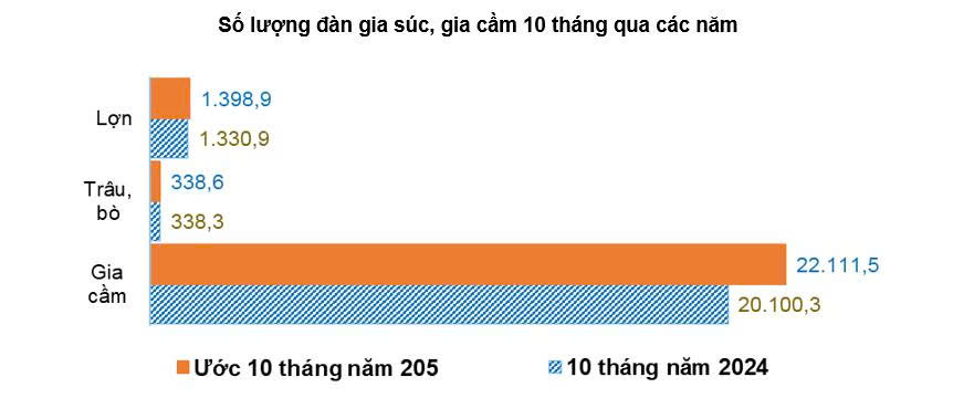 So với cùng kỳ năm trước, toàn tỉnh có 26,6 nghìn con trâu, giảm 0,33%; có 312 nghìn con bò, tăng 0,12% (trong đó đàn bò sữa 29,5 nghìn con, giảm 0,34% do dịch tiêu chảy đã làm nhiều con chết và giá thu mua sữa giảm, nhiều hộ dân đang thanh lý đàn bò sữa); có 1.398,9 nghìn con lợn, tăng 5,1% (lợn không bao gồm lợn con chưa tách mẹ có 1.356,4 nghìn con, tăng 4,78%); có 22.111,5 nghìn con gia cầm, tăng 10,01%, trong đó gà các loại 15.561,6 nghìn con, chiếm 70,38% trong tổng đàn gia cầm, tăng 11,89% (đàn gà tăng mạnh do Công ty cổ phần MeBi Farm, quy mô hiện có trên 202 nghìn con gà đẻ trứng đã góp phần đáng kể vào việc nâng tổng đàn và sản lượng trứng tăng). Sản lượng thịt hơi các loại ước 10 tháng năm 2025 đạt 286.903 tấn, tăng 7,52% so với cùng kỳ năm trước.