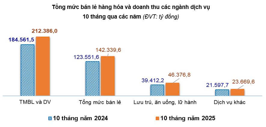 Lũy kế 10 tháng năm 2025, tổng mức bán lẻ hàng hóa và doanh thu các ngành dịch vụ ước đạt 212.386 tỷ đồng, tăng 15,08% so với cùng kỳ năm trước. Trong đó: tổng mức bán lẻ ước đạt 142.339,6 tỷ đồng, tăng 15,21% so với cùng kỳ năm trước; doanh thu lưu trú, ăn uống và lữ hành ước đạt 46.376,8 tỷ đồng, tăng 17,67% so với cùng kỳ năm trước; doanh thu các ngành dịch vụ ước đạt 23.669,6 tỷ đồng, tăng 9,59% so với cùng kỳ năm trước.