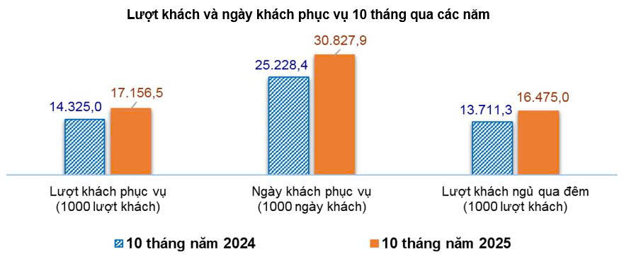 Lượt khách phục vụ trong tháng ước đạt 1.892,2 nghìn lượt, tăng 1,18% so tháng trước và tăng 40,03% so với cùng kỳ năm trước (trong đó lượt khách trong ngày ước đạt 76,6 nghìn lượt, tăng 0,96% so với tháng trước và tăng 14,34% so với cùng kỳ năm trước); ngày khách phục vụ ước đạt 3.313,2 nghìn ngày khách, tăng 1,47% so với tháng trước và tăng 44,44% so với cùng kỳ năm trước. Lũy kế 10 tháng năm 2025 lượt khách ước đạt 17.156,5 nghìn lượt, tăng 19,77% so với cùng kỳ năm trước (trong đó lượt khách trong ngày ước đạt 681,6 nghìn lượt, tăng 11,06% so với cùng kỳ năm trước); ngày khách phục vụ ước đạt 30.827,9 nghìn ngày khách, tăng 22,2% so với cùng kỳ năm trước.