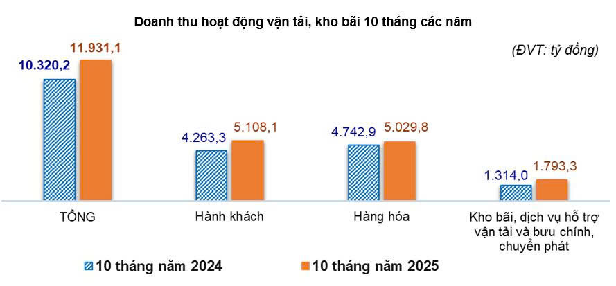 - Doanh thu hoạt động vận tải, kho bãi: Trong tháng ước đạt 1.300,5 tỷ đồng, tăng 5,92% so với tháng trước và tăng 19,94% so với cùng kỳ năm trước. Lũy kế 10 tháng năm 2025 ước đạt 11.931,1 tỷ đồng, tăng 15,61% so với cùng kỳ năm trước. Trong đó: doanh thu vận tải hành khách ước đạt 5.108,1 tỷ đồng, tăng 19,82% so với cùng kỳ năm trước; doanh thu vận tải hàng hóa ước đạt 5.029,8 tỷ đồng, tăng 6,05%; doanh thu kho bãi, dịch vụ hỗ trợ vận tải ước đạt 1.741 tỷ đồng, tăng 37,31%; doanh thu bưu chính, chuyển phát ước đạt 52,2 tỷ đồng, tăng 13,4%.