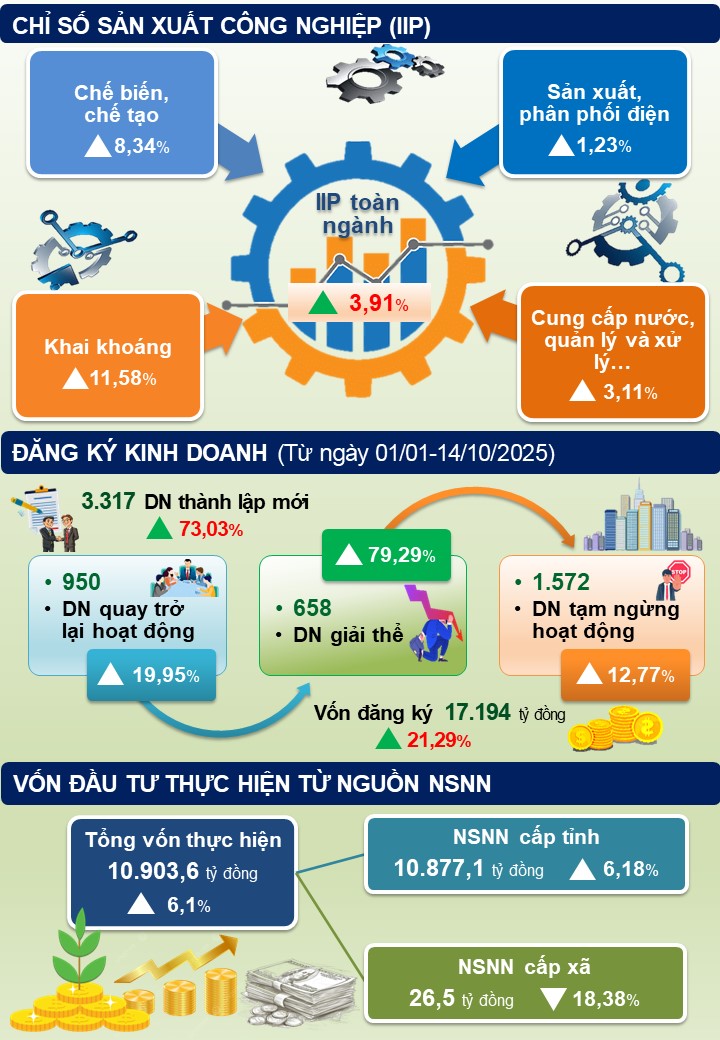 Tính từ đầu năm đến ngày 14/10/2025, toàn tỉnh có 3.317 doanh nghiệp thành lập mới, tăng 73,03% so với cùng kỳ; 1.572 doanh nghiệp đăng ký tạm ngừng hoạt động, tăng 12,77%; 658 doanh nghiệp giải thể, tăng 79,29%; 950 doanh nghiệp đã hoạt động trở lại, tăng 19,95% so cùng kỳ. Tổng số vốn trong 10 tháng đầu năm 2025 các doanh nghiệp đã đăng ký 17.194 tỷ đồng, tăng 21,29% vốn đăng ký so với cùng kỳ.