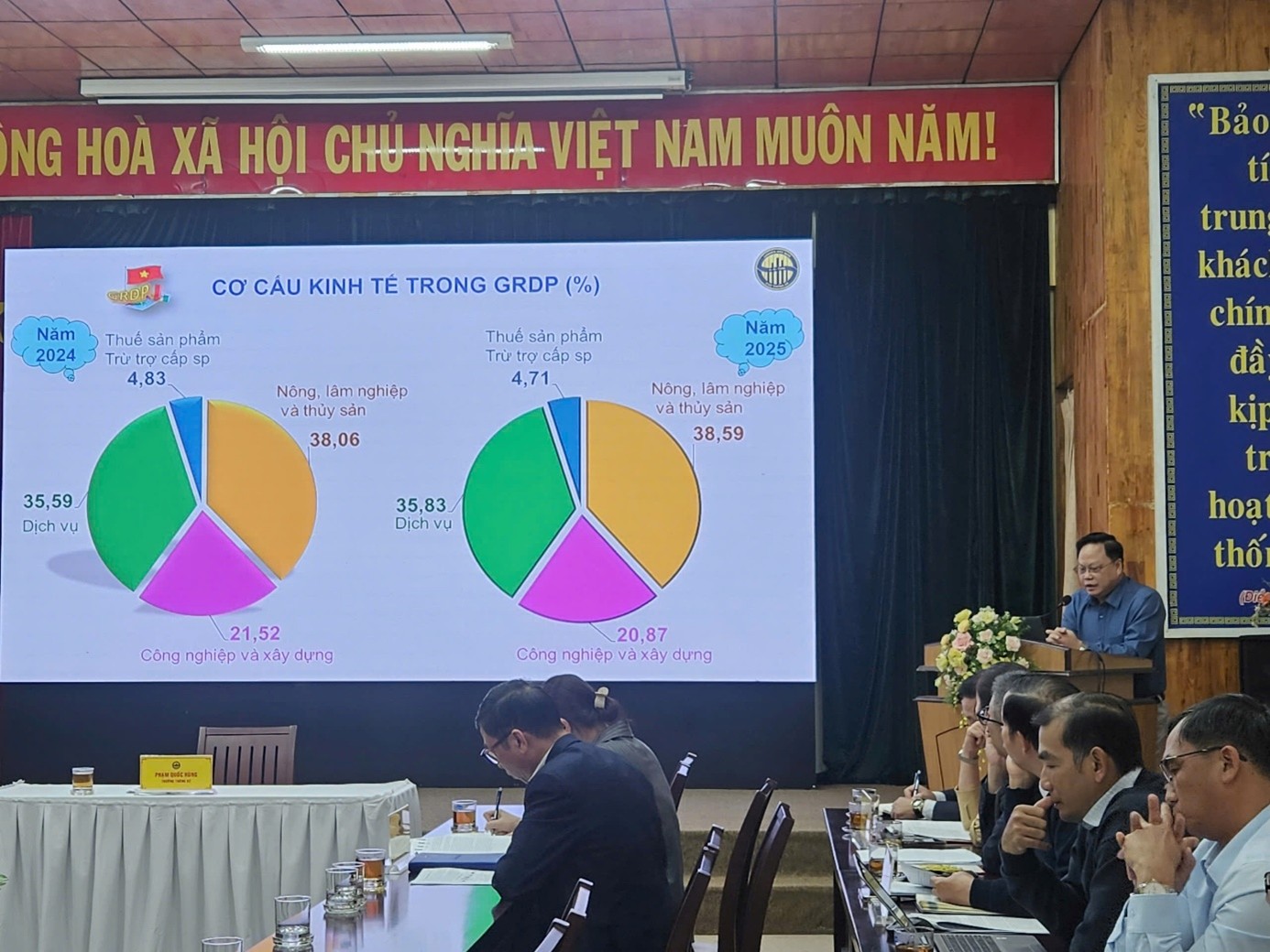 Tại buổi họp báo, ông Phạm Quốc Hùng - Trưởng Thống kê tỉnh đã thông báo một số vấn đề cơ bản về tình hình kinh tế - xã hội năm 2025 của tỉnh. Tổng sản phẩm trên địa bàn (GRDP) năm 2025 của tỉnh Lâm Đồng tăng 6,42% so với năm trước. Trong đó, khu vực nông, lâm nghiệp và thủy sản tăng 5,10%, đóng góp 1,68 điểm phần trăm; khu vực công nghiệp và xây dựng tăng 5,54%, đóng góp 1,21 điểm phần trăm; khu vực dịch vụ tăng 8,28%, mức tăng cao nhất trong ba năm gần đây, đóng góp 3,33 điểm phần trăm; thuế sản phẩm trừ trợ cấp sản phẩm tăng 4%, đóng góp 0,20 điểm phần trăm. Cơ cấu kinh tế chuyển dịch theo hướng tích cực, trong đó khu vực nông, lâm nghiệp và thủy sản chiếm 38,59%; khu vực công nghiệp và xây dựng chiếm 20,87%; khu vực dịch vụ chiếm 35,83%; thuế sản phẩm trừ trợ cấp sản phẩm chiếm 4,71%. GRDP bình quân đầu người năm 2025 ước đạt 105,24 triệu đồng/người, tăng 12,7%, tương đương 4.047,6 USD/người. Năng suất lao động theo giá hiện hành đạt 186,02 triệu đồng/lao động, tiếp tục được cải thiện rõ rệt so với các năm trước.