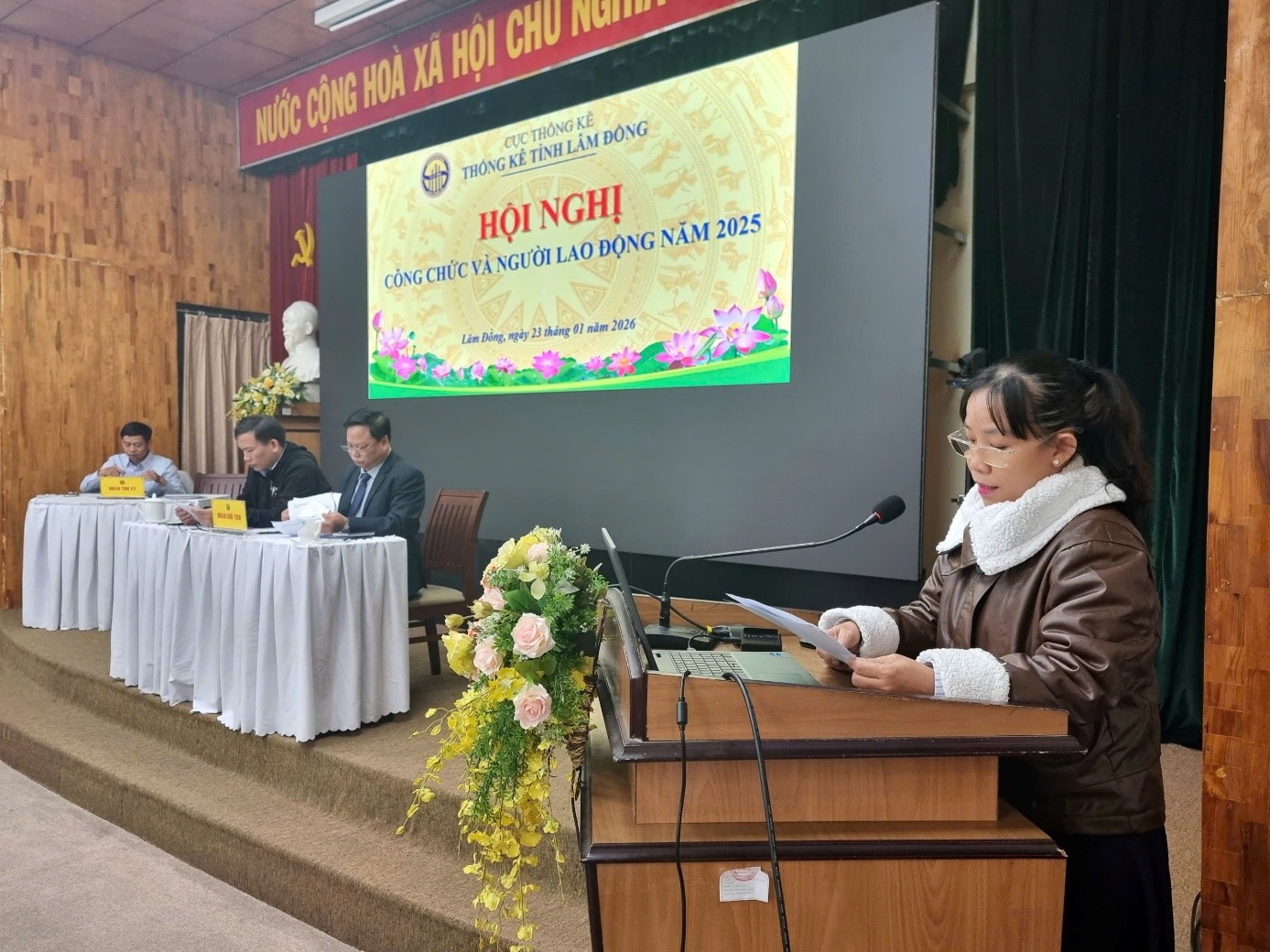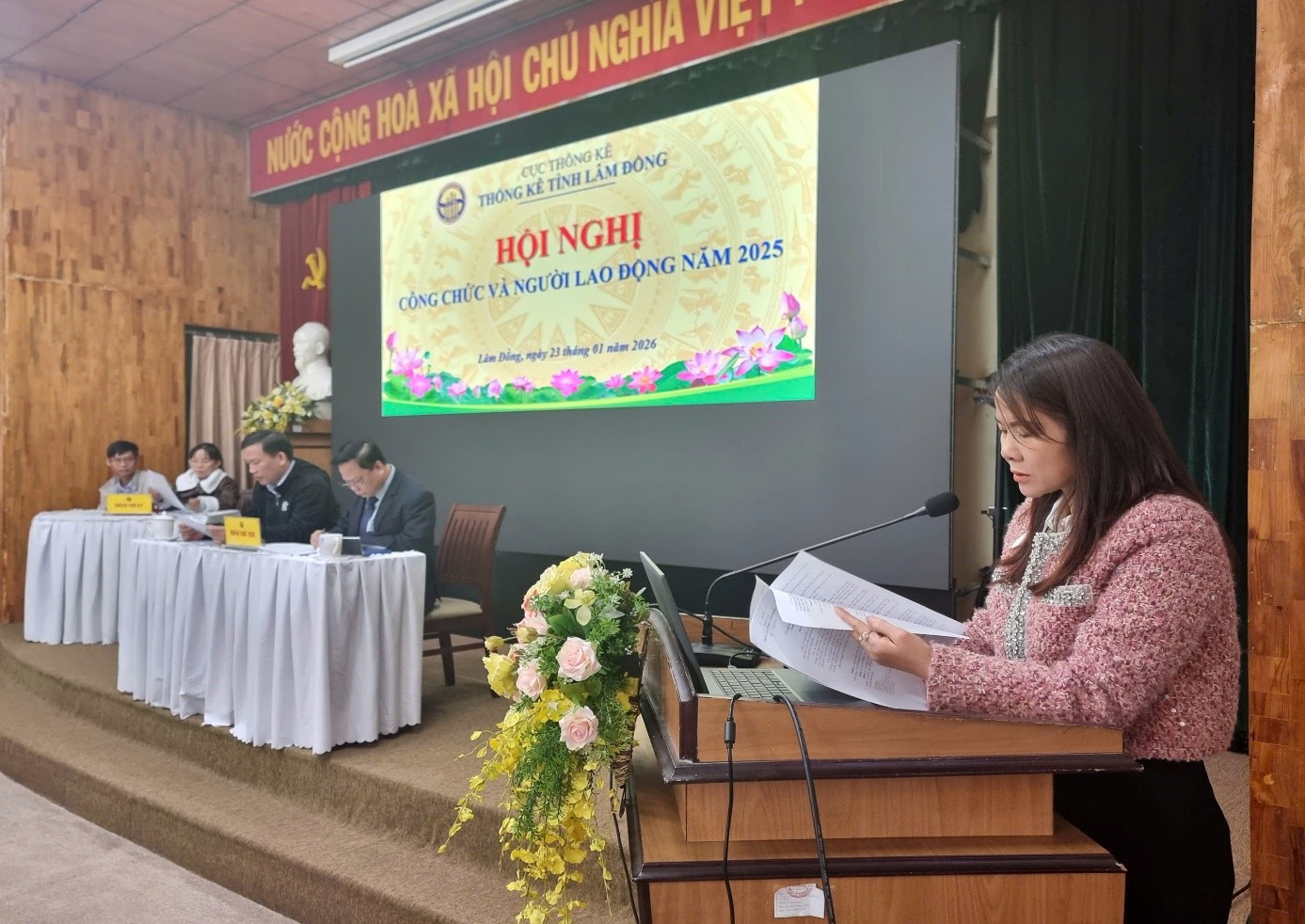 Đ/c Nguyễn Thị Thùy Hương - Thư ký đoàn thông qua Nghị quyết Hội nghị Công chức và người lao động Thống kê tỉnh Lâm Đồng