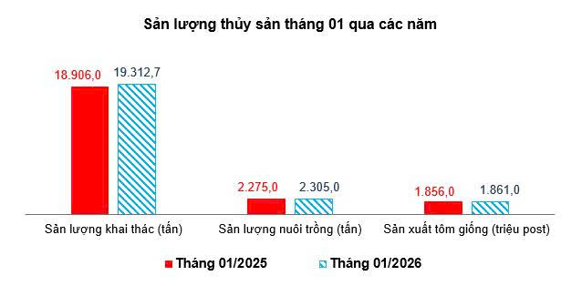 - Sản lượng nuôi trồng trong tháng ước đạt 2.305 tấn, tăng 1,32% so với cùng kỳ năm trước (trong đó tôm nuôi nước lợ ước đạt 350 tấn, tăng 0,57%).