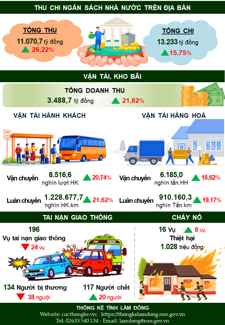 Hoạt động thương mại, dịch vụ và du lịch tăng khá. Tổng mức bán lẻ hàng hóa và doanh thu dịch vụ tăng 12,73%, lượng khách du lịch tăng 20,30% so với cùng kỳ, hoạt động vận tải đáp ứng nhu cầu đi lại và vận chuyển hàng hóa, cho thấy sức mua, nhu cầu tiêu dùng và các hoạt động lưu trú, ăn uống, vui chơi giải trí phục hồi tích cực. Thu ngân sách nhà nước trên địa bàn tăng 26,22%.