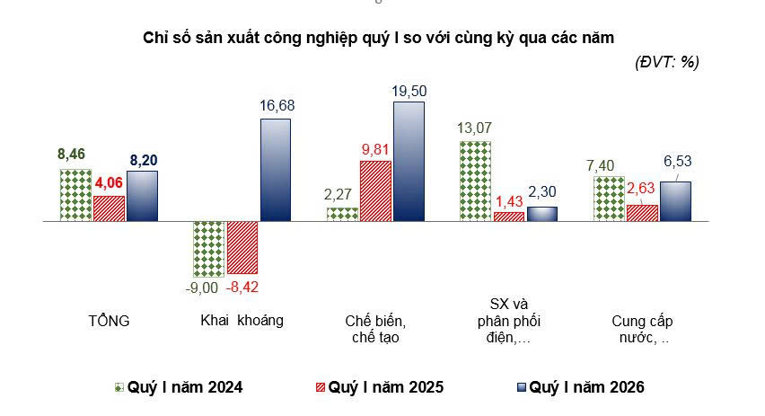 Tính chung quý I năm 2026, chỉ số sản xuất toàn ngành công nghiệp tăng 8,20% so với cùng kỳ năm trước. Trong đó ngành công nghiệp khai khoáng tăng 16,68%; ngành công nghiệp chế biến chế tạo tăng 19,50%; ngành sản xuất và phân phối điện, khí đốt, nước nóng, hơi nước và điều hòa không khí tăng 2,30%; ngành cung cấp nước, hoạt động quản lý và xử lý rác thải, nước thải tăng 6,53%.