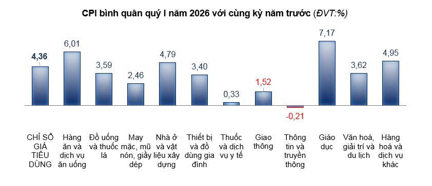 - Nguyên nhân giảm CPI bình quân quý I năm 2026: Chỉ số giá nhóm thông tin và truyền thông giảm 0,21%, góp phần làm CPI chung giảm 0,01 điểm phần trăm, do giá điện thoại thế hệ cũ giảm khi các doanh nghiệp áp dụng chương trình giảm giá, kích cầu đối với các dòng điện thoại thông minh đã được tung ra thị trường một thời gian. Giá gas trong nước biến động theo giá gas thế giới, bình quân quý I/2026 giá gas giảm 5,55% so với cùng kỳ năm trước.