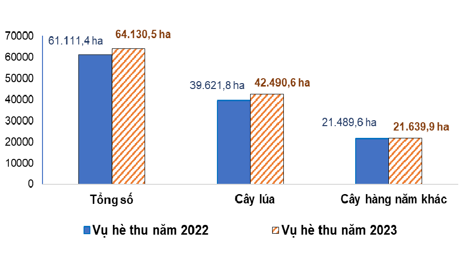 Tính đến ngày 15/7/2023 toàn tỉnh xuống giống vụ hè thu đạt 64.130,5 ha, tăng 4,9% so với cùng kỳ năm trước, trong đó: cây lúa diện tích đạt 42.490,6 ha, tăng 7,2% (diện tích tăng do điều kiện nguồn nước đầy đủ, ngay từ đầu vụ một số huyện như Đức Linh, Tánh Linh đã triển khai xuống giống sớm tập trung, đồng loạt, phù hợp cho từng khu vực, từng cánh đồng); cây bắp diện tích đạt 6.320,2 ha, giảm 7,4%; cây đậu phụng diện tích đạt 2.403,4 ha, giảm 5,1%; cây lang diện tích đạt 402,1 ha, tăng 95,1% (diện tích tăng chủ yếu ở huyện Hàm Thuận Nam); cây rau các loại diện tích đạt 3.904,7 ha, giảm 2,6%; đậu các loại diện tích đạt 3.603,4 ha, tăng 12,4%.