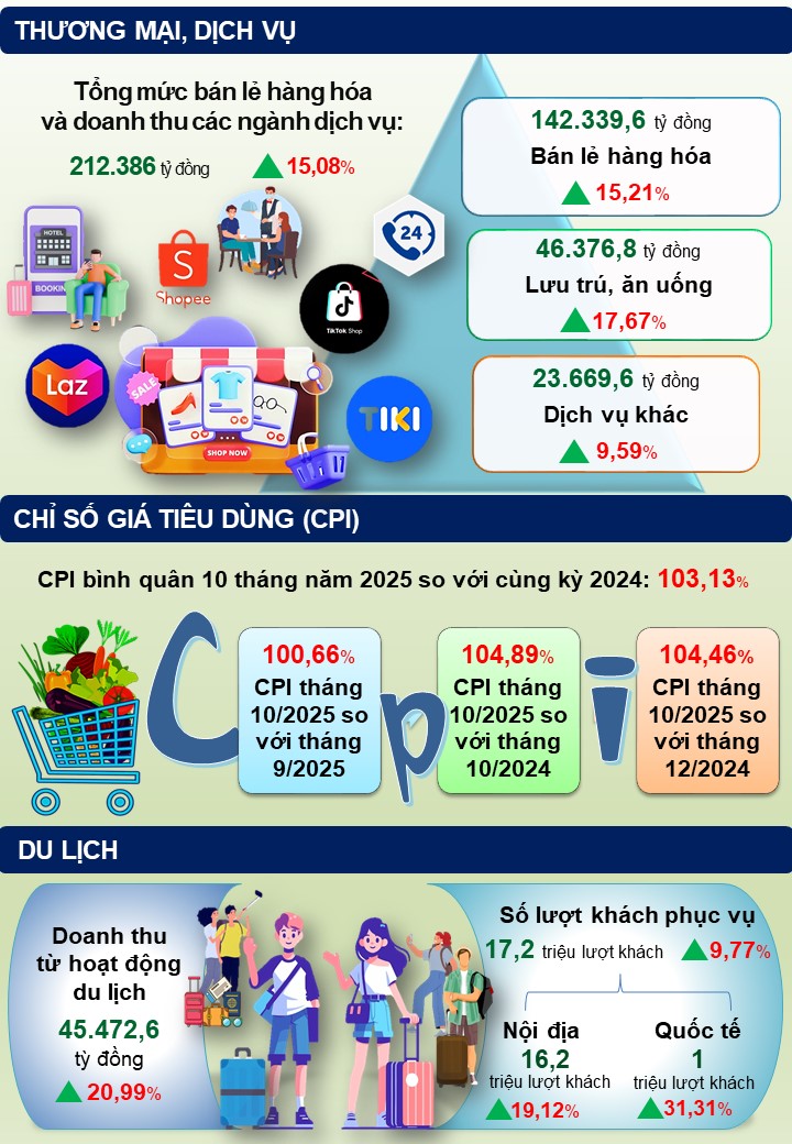 Lũy kế 10 tháng năm 2025, tổng mức bán lẻ hàng hóa và doanh thu các ngành dịch vụ ước đạt 212.386 tỷ đồng, tăng 15,08% so với cùng kỳ năm trước. Trong đó: tổng mức bán lẻ ước đạt 142.339,6 tỷ đồng, tăng 15,21% so với cùng kỳ năm trước; doanh thu lưu trú, ăn uống và lữ hành ước đạt 46.376,8 tỷ đồng, tăng 17,67% so với cùng kỳ năm trước; doanh thu các ngành dịch vụ ước đạt 23.669,6 tỷ đồng, tăng 9,59% so với cùng kỳ năm trước.