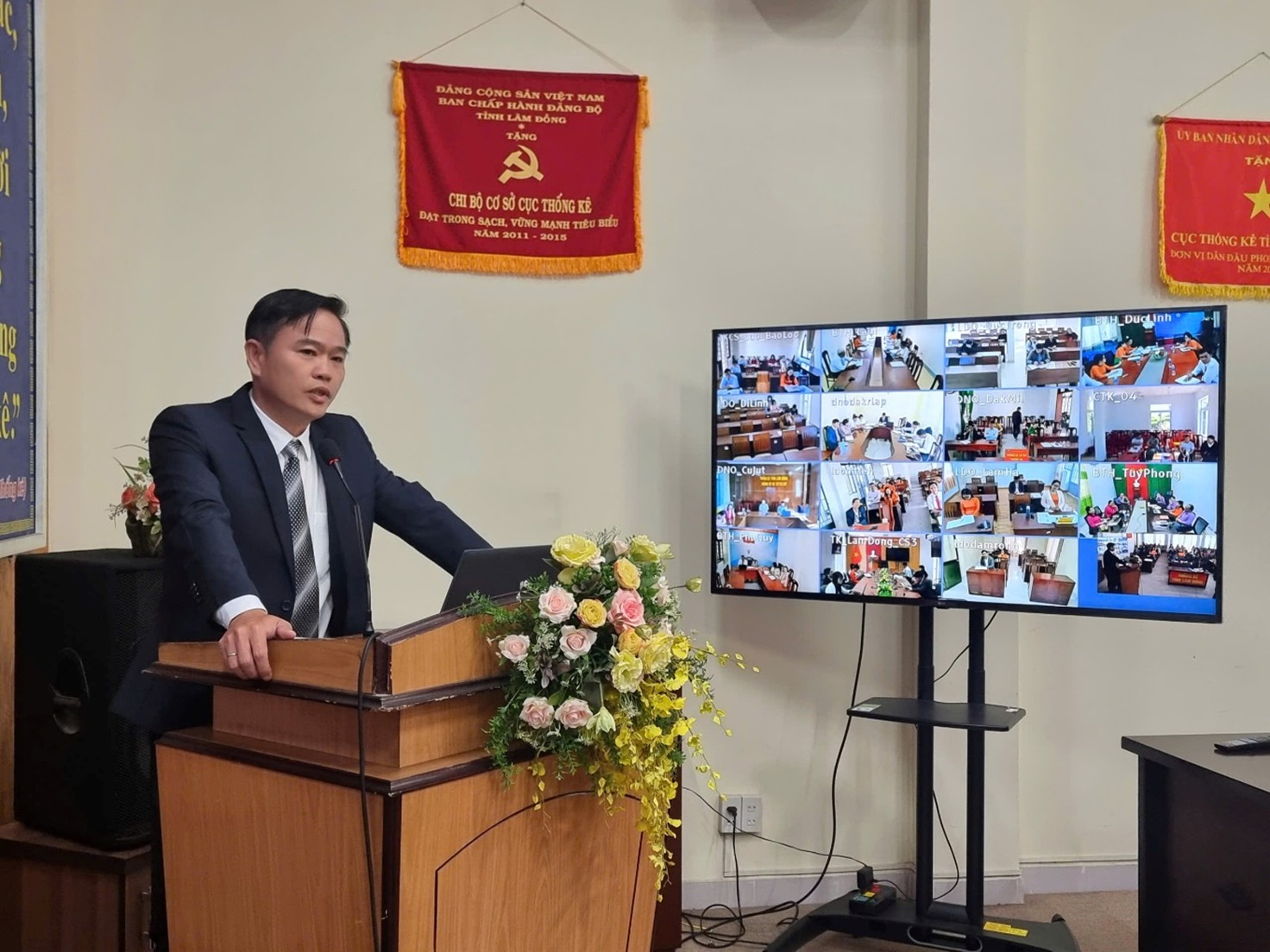 Đồng chí Phạm Quốc Hùng - Bí thư Đảng ủy, Trưởng Thống kê tỉnh chủ trì Hội nghị. Tham dự trực tiếp tại điểm cầu trung tâm có các đồng chí Phó Trưởng Thống kê tỉnh; Lãnh đạo và công chức các Phòng thuộc cơ quan Thống kê tỉnh; Lãnh đạo, công chức Thống kê cơ sở Đà Lạt. Hội nghị được kết nối trực tuyến đến 15 điểm cầu Thống kê cơ sở trực thuộc trên toàn tỉnh.