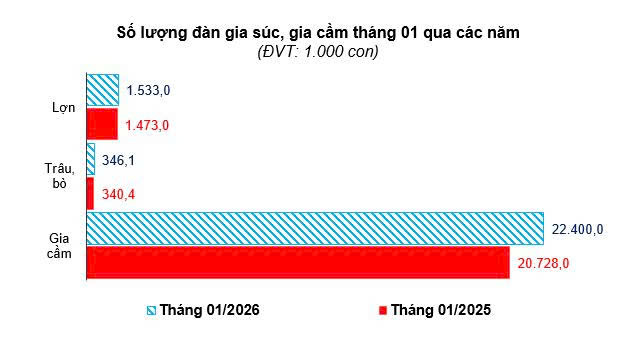 Tình hình chăn nuôi tiếp tục duy trì và phát triển về tổng đàn vật nuôi;công tác kiểm dịch, phòng, chống dịch bệnh được thực hiện tốt (đặc biệt là trại chăn nuôi gia công) nên nhìn chung tổng đàn các loại vật nuôi vẫn giữ được mức tăng so với cùng kỳ. Sản lượng thịt hơi các loại ước tính tháng 01/2026 đạt 28.729,6 tấn, tăng 7,2% so với cùng kỳ năm trước.