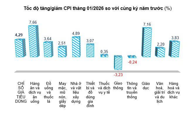 * Các nguyên nhân làm giảm CPI trong tháng: Giá hàng ăn và dịch vụ ăn uống giảm 0,33% so với tháng trước, do đang vào thời điểm thu hoạch, nguồn cung các mặt hàng gạo; rau tươi dồi dào nên giá lương thực, thực phẩm giảm so với tháng trước. Giá xăng, dầu trong nước được điều chỉnh vào các ngày 08, 15 và 22 tháng 01/2026, tính bình quân chung tháng 01/2026 chỉ số giá mặt hàng nhiên liệu giảm 5,06% so với tháng trước.