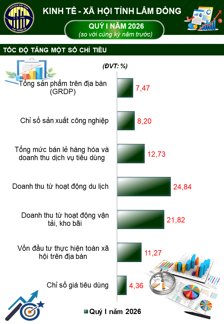 Trong tháng 3 và quý I năm 2026, tình hình kinh tế - xã hội tỉnh Lâm Đồng nhìn chung tiếp tục duy trì xu hướng ổn định và tăng trưởng khá trong bối cảnh tình hình thế giới còn nhiều yếu tố biến động, giá cả một số yếu tố đầu vào sản xuất ở mức cao, tác động nhất định đến hoạt động sản xuất, kinh doanh. Trên địa bàn tỉnh, nhiều ngành, lĩnh vực chủ yếu tiếp tục tăng so với cùng kỳ năm trước. GRDP quý I ước tăng 7,47% so với cùng kỳ năm trước; cả ba khu vực kinh tế đều duy trì đà tăng, trong đó khu vực dịch vụ tiếp tục là động lực tăng trưởng nổi bật.