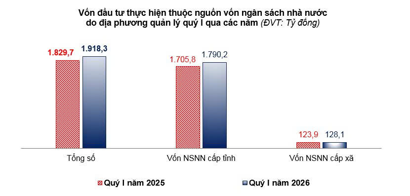 Quý I năm 2026, vốn đầu tư thực hiện từ nguồn ngân sách nhà nước do địa phương quản lý ước đạt 1.918,3 tỷ đồng, đạt 12,60% so với kế hoạch năm, tăng 4,84% so với cùng kỳ năm trước; trong đó: Vốn ngân sách nhà nước cấp tỉnh ước đạt 1.790,2 tỷ đồng, tăng 4,95% (vốn cân đối ngân sách tỉnh ước đạt 839,5 tỷ đồng, tăng 2,47% so với cùng kỳ; vốn trung ương hỗ trợ đầu tư theo mục tiêu ước đạt 255,6 tỷ đồng, giảm 46,24% so với cùng kỳ; vốn nước ngoài 29,6 tỷ đồng, giảm 27,89% so với cùng kỳ; vốn xổ số kiến thiết 655 tỷ đồng, tăng 80,25% so với cùng kỳ; vốn khác 10,5 tỷ đồng, tăng 60,09% so với cùng kỳ); vốn ngân sách nhà nước cấp xã ước đạt 128,1 tỷ đồng, tăng 3,39% so với cùng kỳ.