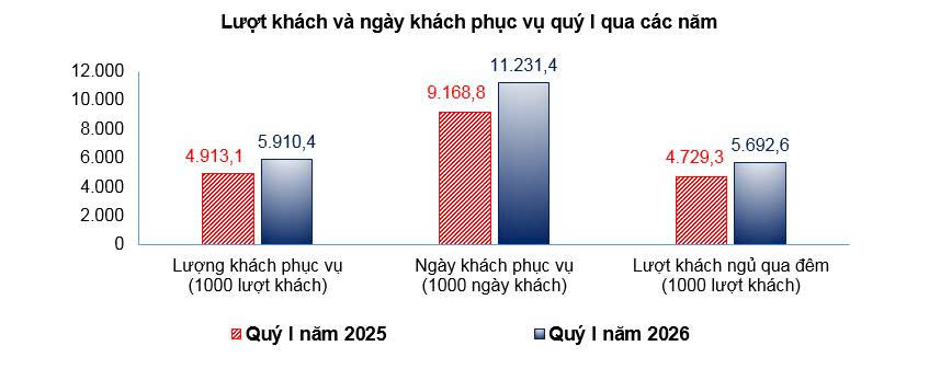 Lượt khách phục vụ trong tháng ước đạt 1.865,1 ngàn lượt, giảm 9% so tháng trước và tăng 22,23% so với cùng kỳ năm trước (trong đó lượt khách trong ngày ước đạt 65,5 ngàn lượt, giảm 11% so với tháng trước và tăng 18,87% so với cùng kỳ năm trước); ngày khách phục vụ ước đạt 3.536 ngàn ngày khách, giảm 8,99% so với tháng trước và tăng 23,76% so với cùng kỳ năm trước. Lượt khách quốc tế trong tháng ước đạt 160 ngàn lượt khách, giảm 5,21% so với tháng trước và tăng 18,57% so với cùng kỳ năm trước; ngày khách phục vụ ước đạt 517,5 ngàn ngày khách, giảm 6,39% so với tháng trước và tăng 22,54% so với cùng kỳ năm trước. Quý I năm 2026 lượt khách phục vụ đạt 5.910,4 ngàn lượt, tăng 20,3% so với cùng kỳ năm trước (trong đó lượt khách trong ngày đạt 217,8 ngàn lượt, tăng 18,51% so với cùng kỳ năm trước); ngày khách phục vụ đạt 11.231,4 ngàn ngày khách, tăng 22,5% so với cùng kỳ năm trước. Lượt khách quốc tế quý I năm 2026 đạt 508,3 ngàn lượt, tăng 23,49% so với cùng kỳ năm trước; ngày khách quốc tế đạt 1.615,6 ngàn ngày khách, tăng 26,1% so với cùng kỳ năm trước.